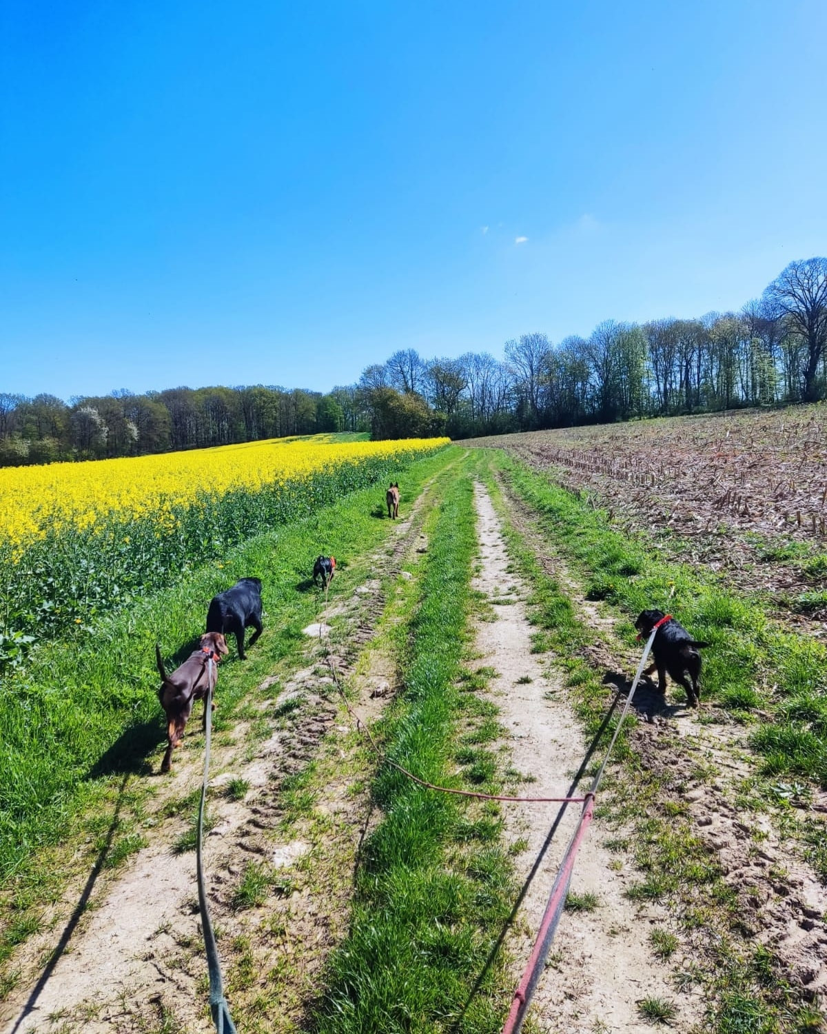 Parce que se dépenser et découvrir le monde est un élément extrêmement important pour votre chien, nous faisons des balades avec eux dès que possible. Le beau Vexin nous offre des chemins de promenade au pied de notre terrain. De quoi partir pour plusieurs heures avec les loulous en passant des champs aux bois, sans oublié des points d'eau pour les jour meilleurs !